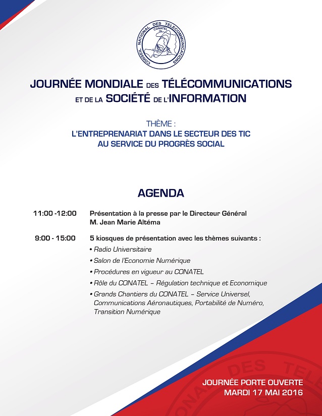 Home » Communications » Grande Journée porte ouverte ce mardi 17 mai 2016 au CONATEL, à l'occasion de la Journée Mondiale des Télécommunications et de la Société de l'Information.