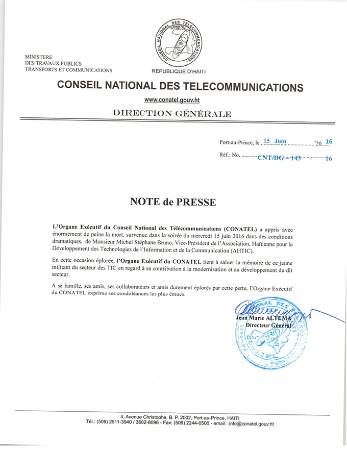Vous êtes iciHome » Communications » Note de presse sur la mort du spécialiste en NTIC, Michel Stéphane BRUNO Note de presse sur la mort du spécialiste en NTIC, Michel Stéphane BRUNO Partager ce texte images: Tweet