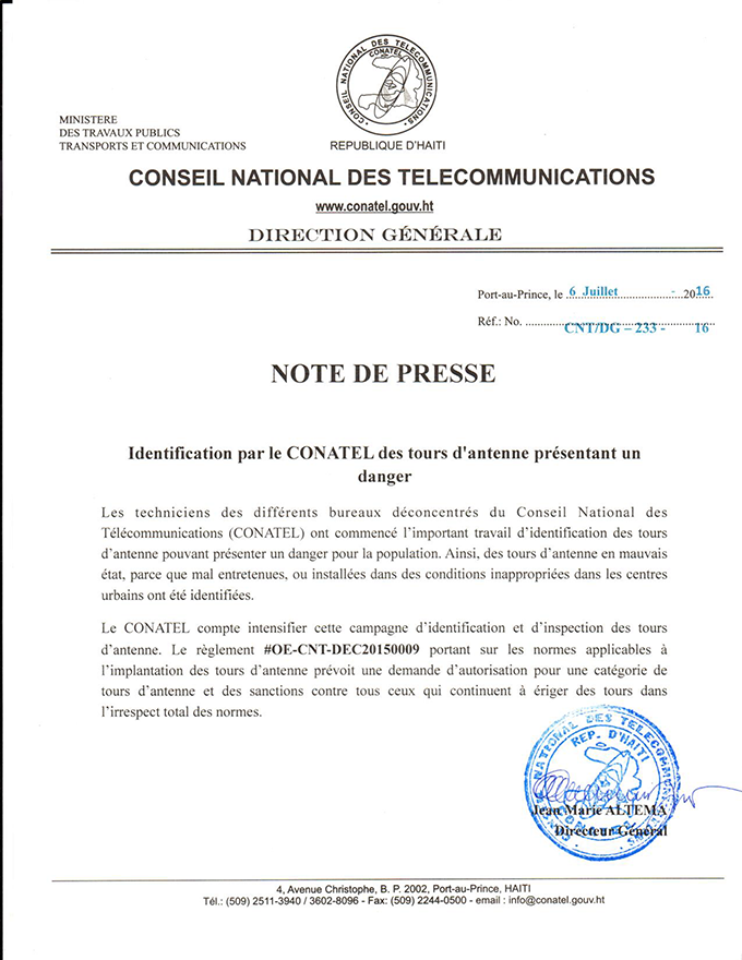 Vous êtes iciHome » Communications » Note de presse - Identification par le CONATEL des tours d'antenne présentant un danger Note de presse - Identification par le CONATEL des tours d'antenne présentant un danger Partager ce texte images: Tweet