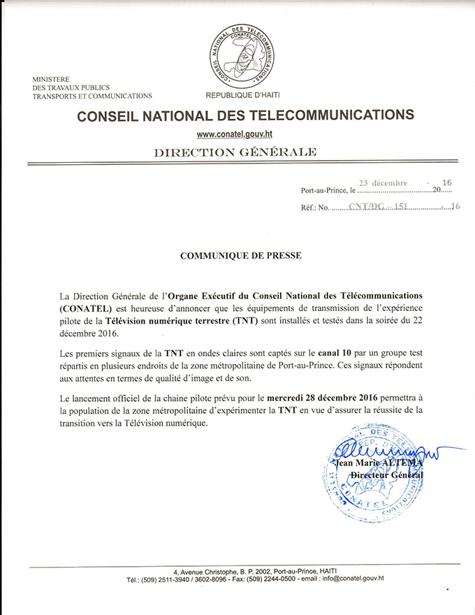Vous êtes iciHome » Communications » Communiqué de Presse relatif à l'experience pilote de la Télévision Numérique Terreste Communiqué de Presse relatif à l'experience pilote de la Télévision Numérique Terreste Partager ce texte images: Tweet