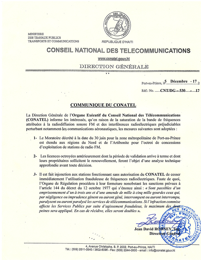 - Le Moratoire décrété à la date du 30 juin pour la zone métropolitaine de Port-au-Prince est étendu aux régions du Nord et de l’Artibonite pour l’octroi de concessions d’exploitation de stations de radio FM.
