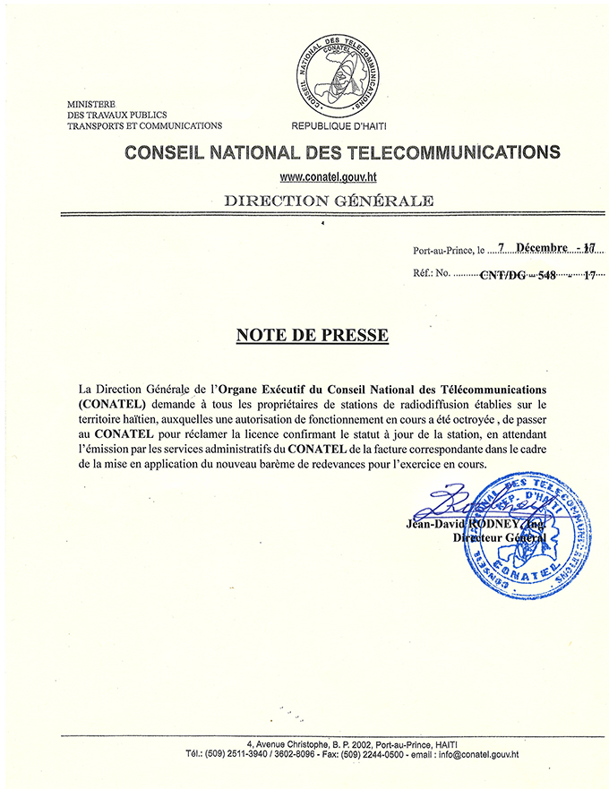 NOTE DE PRESSE : Levée de la suspension par le CONATEL de l’émission « Boukante La Pawòl » sur Radio Méga .