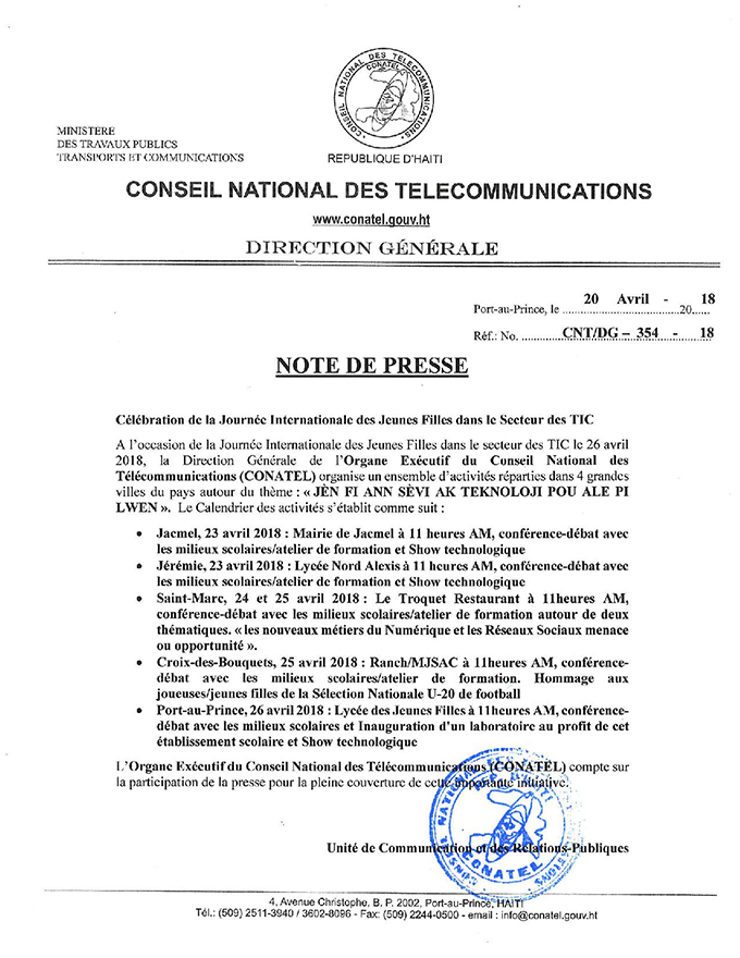 A l’occasion de la Journée Internationale des Jeunes Filles dans le secteur des TIC le 26 avril 2018, la Direction Générale de l’Organe Exécutif du Conseil National des Télécommunications (CONATEL) organise un ensemble d’activités réparties dans 4 grandes villes du pays autour du thème : « JÈN FI ANN SÈVI AK TEKNOLOJI POU ALE PI LWEN ». Le Calendrier des activités s’établit comme suit :