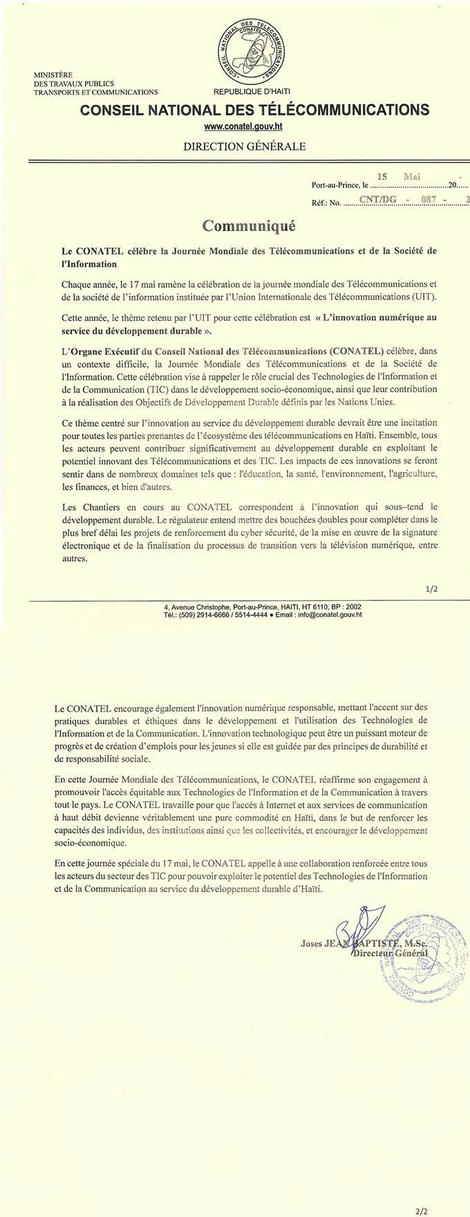 Vous êtes iciHome » Communications » Communiqué relatif à la célébration de la Journée Mondiale des Télécommunications 17 mai 2024 Communiqué relatif à la célébration de la Journée Mondiale des Télécommunications 17 mai 2024 Partager ce texte images: Tweet