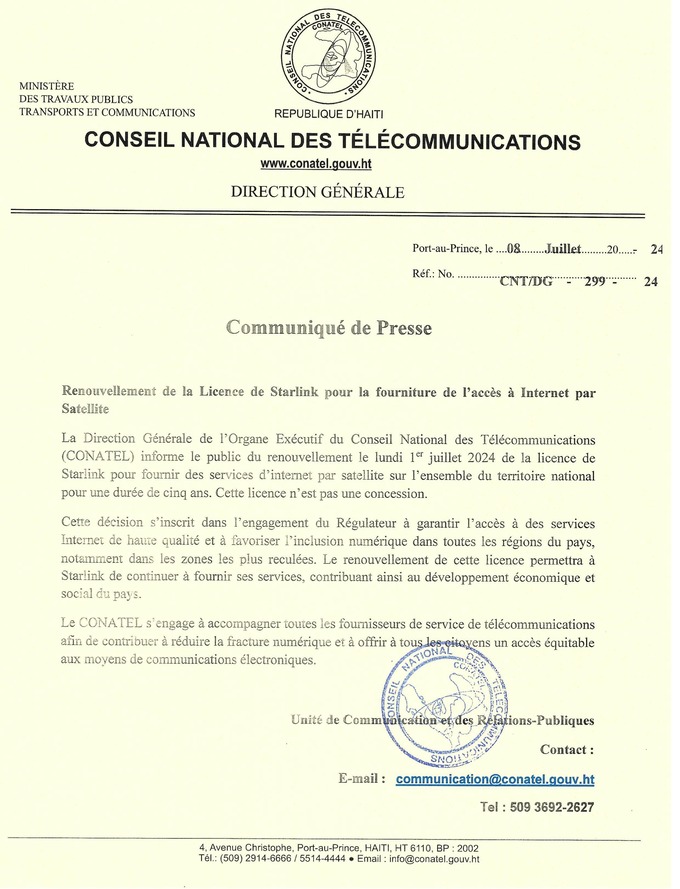 Vous êtes iciHome » Communications » Renouvellement de la Licence de Starlink pour la fourniture de l’accès à Internet par Satellite Renouvellement de la Licence de Starlink pour la fourniture de l’accès à Internet par Satellite Partager ce texte images: Tweet
