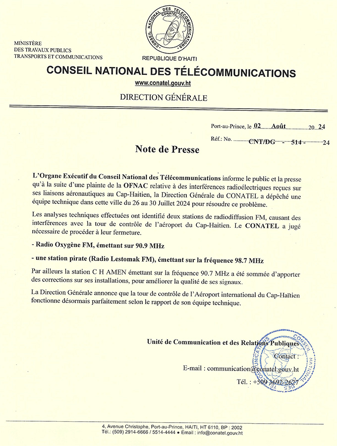 Vous êtes iciHome » Communications » Interférences radioélectriques reçues sur les liaisons aéronautiques au Cap-Haïtien Interférences radioélectriques reçues sur les liaisons aéronautiques au Cap-Haïtien Partager ce texte images: Tweet