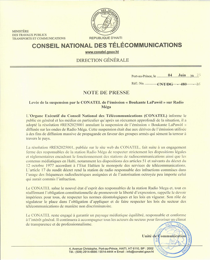 NOTE DE PRESSE : Levée de la suspension par le CONATEL de l’émission « Boukante La Pawòl » sur Radio Méga .